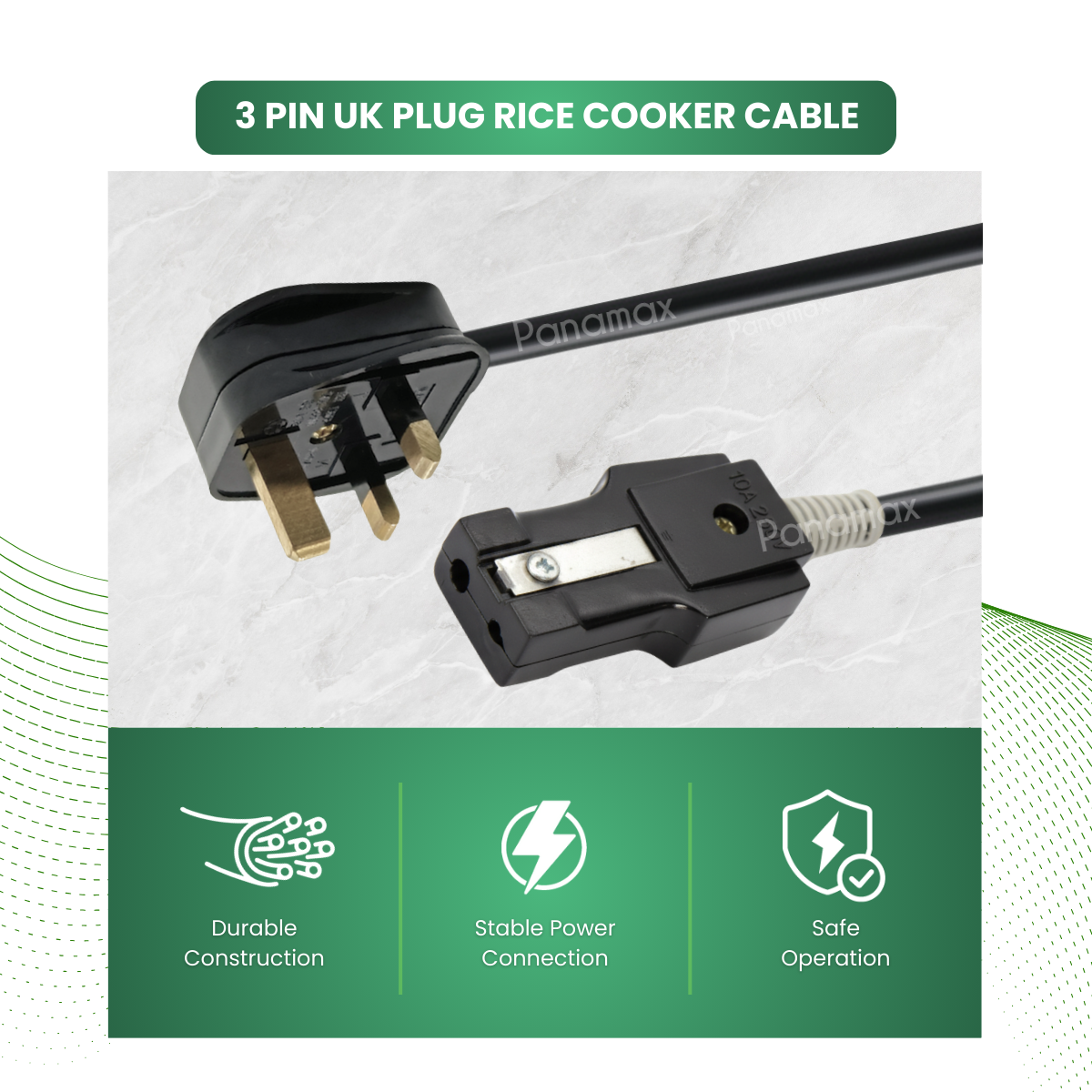 This specialized 3 PIN UK PLUG TO RICE COOKER PLUG CABLE provides safe power connectivity for rice cookers and similar kitchen appliances in the UK market, featuring proper grounding and safety certifications for reliable kitchen use.