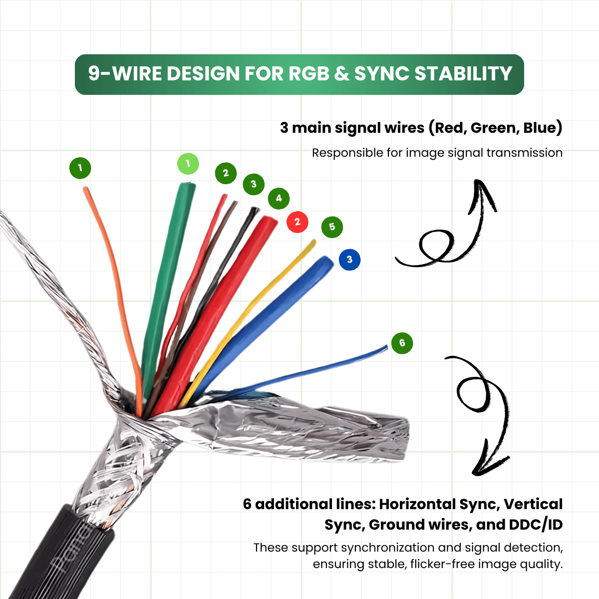 🖥️ Full 3+6 Core Shielding: Utilizes all nine essential wires (3 video + 6 ground) for superior signal integrity, minimizing crosstalk and delivering a crisp picture at high resolutions.