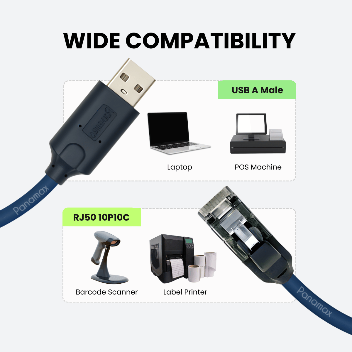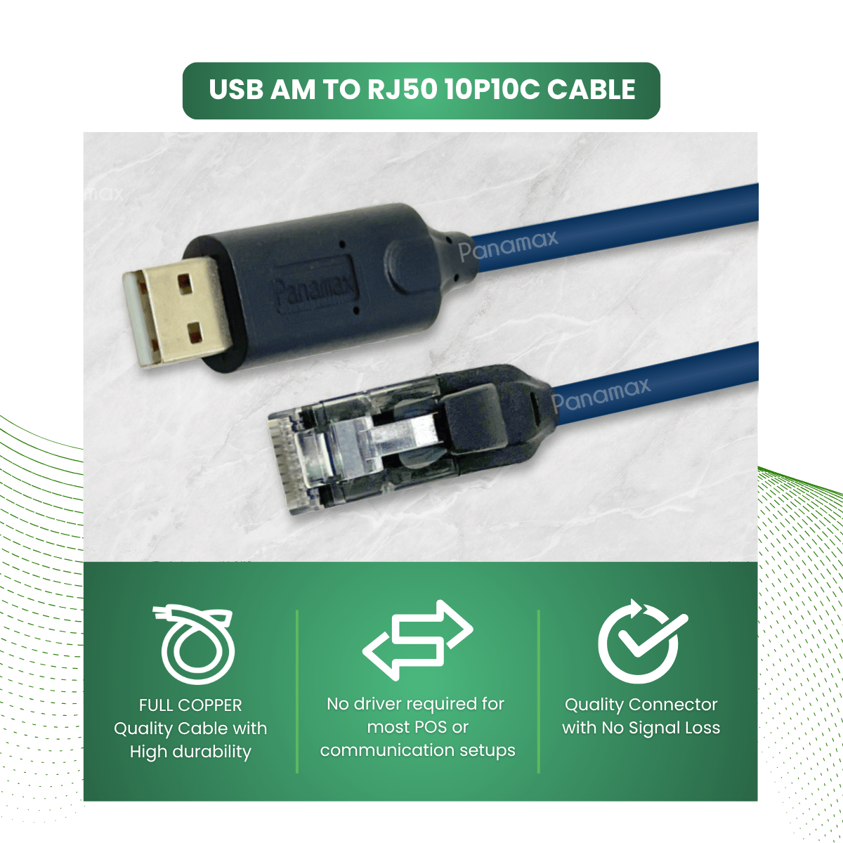🔌 Standard Connectors: Features a USB Type-A Male (USB AM) on one end and a keyed RJ50 10P10C plug on the other for a perfect fit.
