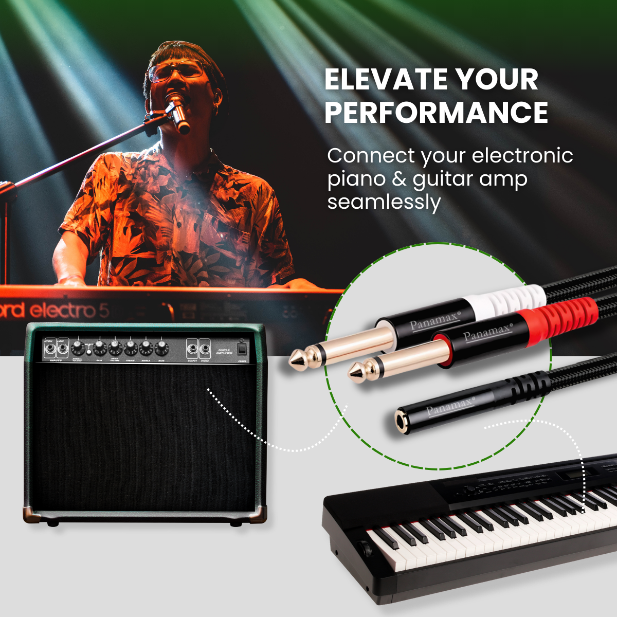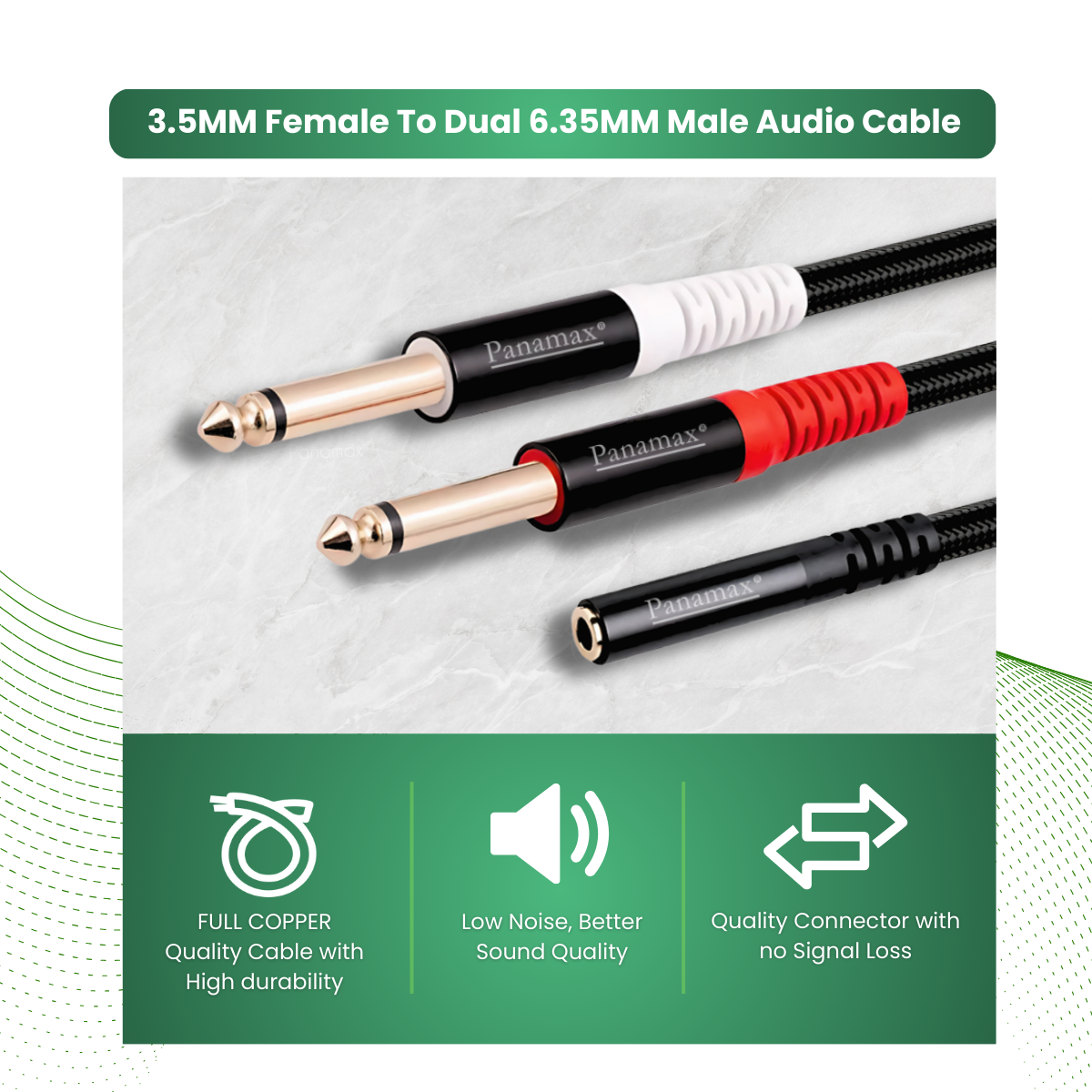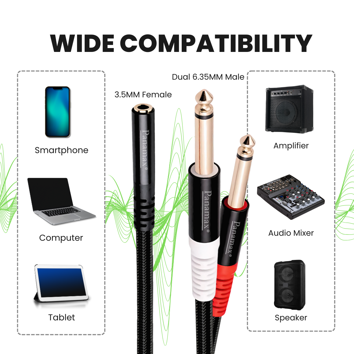 🔌 3.5mm Female to Dual 6.35mm Male: Splits one 3.5mm output to two 6.35mm inputs.