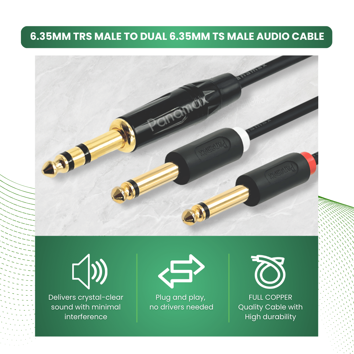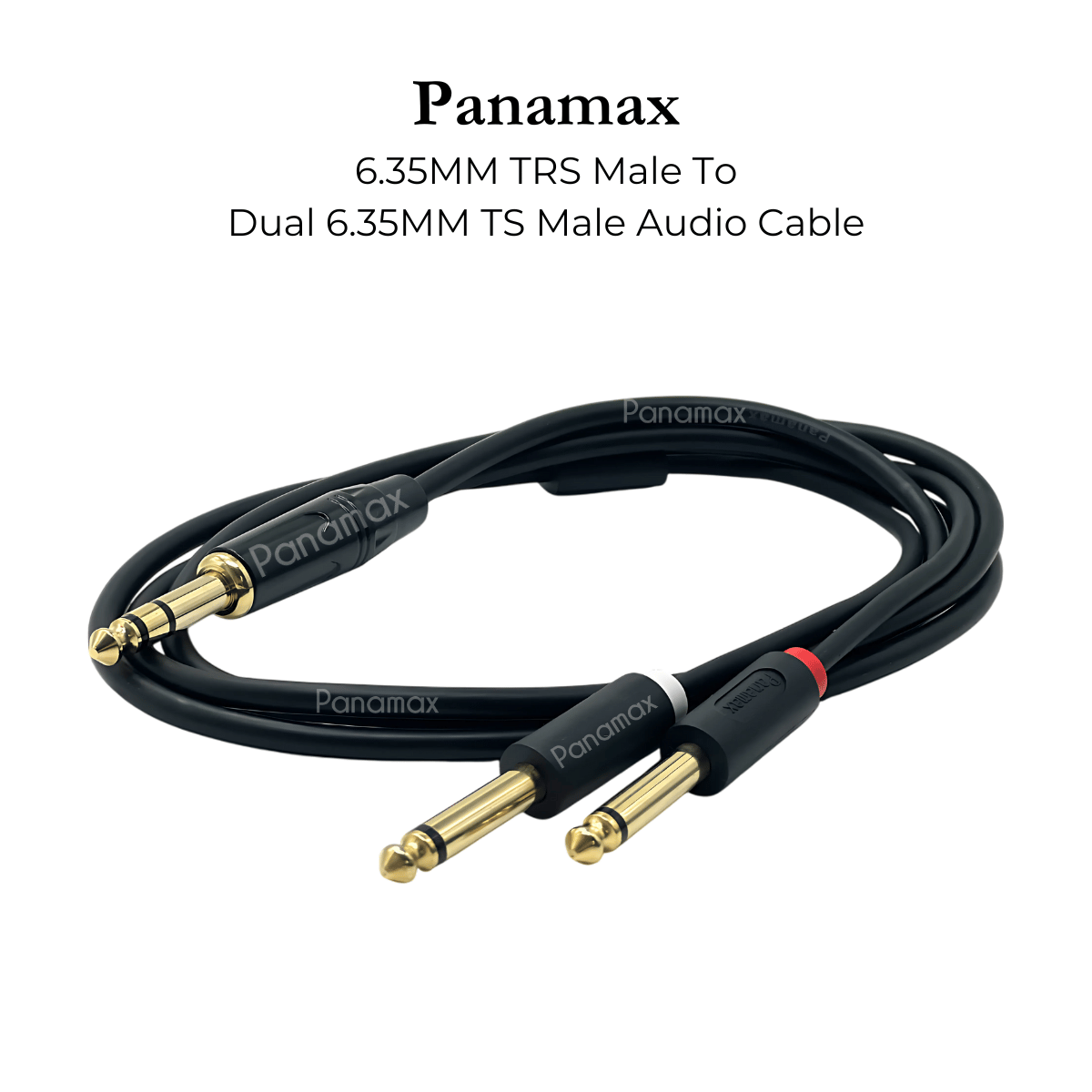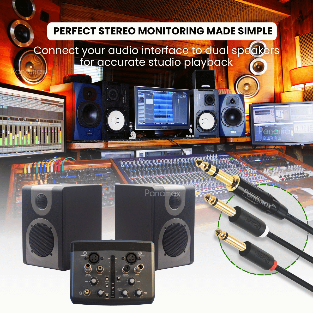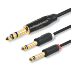 This EC-1238, Y-cable converts a single 6.35mm TRS stereo output into two isolated mono 6.35mm TS signals, perfect for routing headphone amp outputs to separate recording channels or monitor systems.