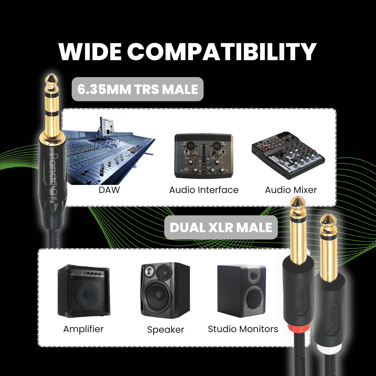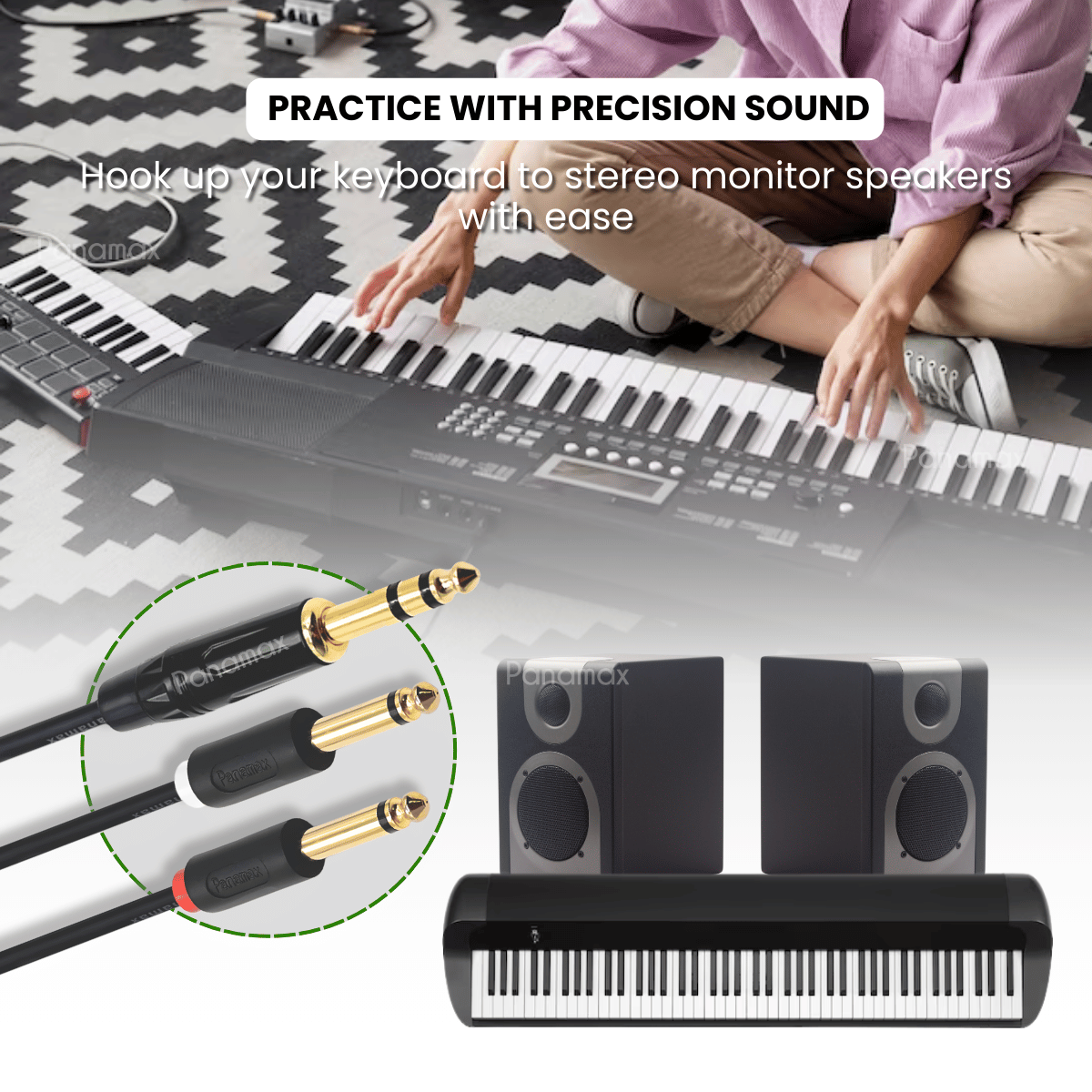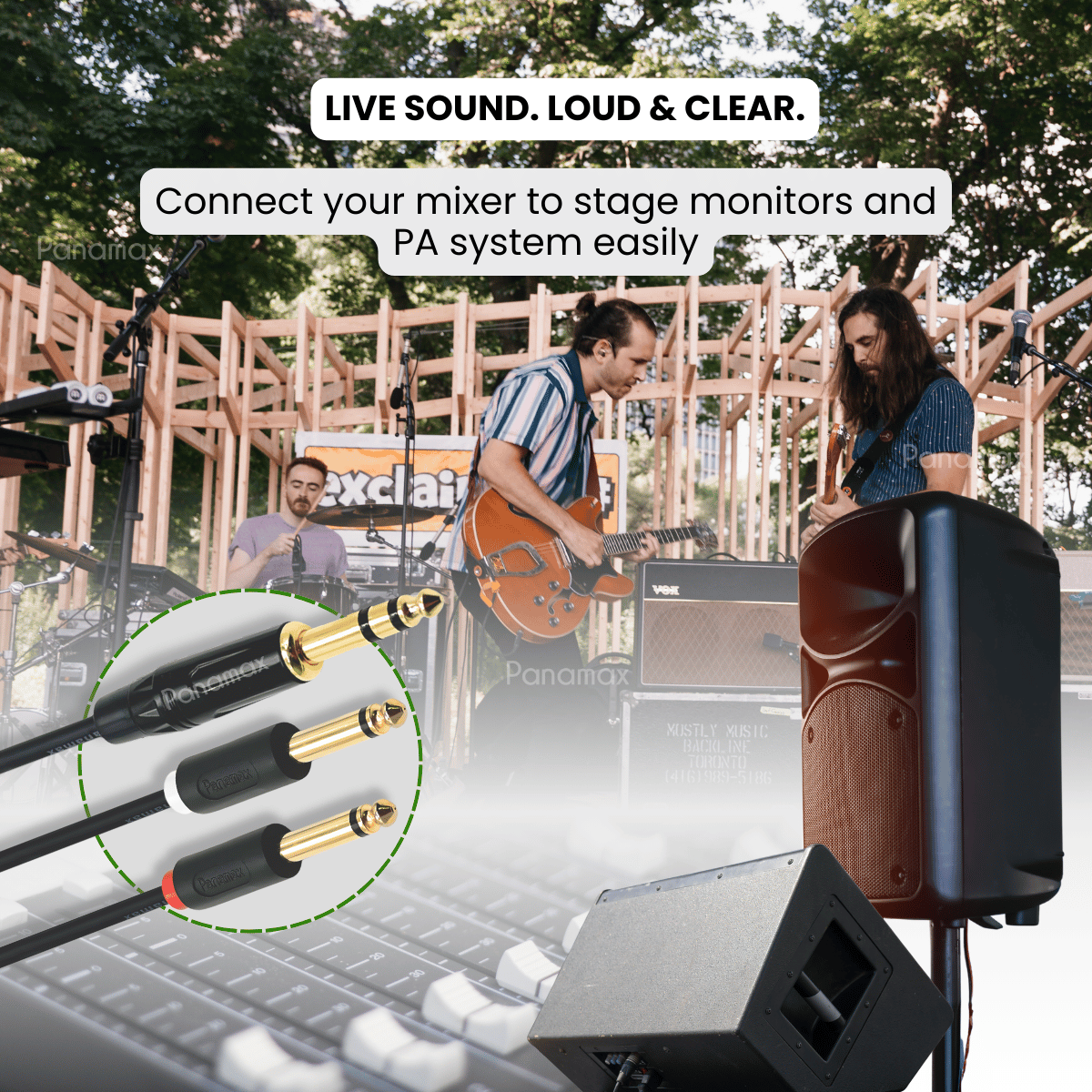 This EC-1238, Y-cable converts a single 6.35mm TRS stereo output into two isolated mono 6.35mm TS signals, perfect for routing headphone amp outputs to separate recording channels or monitor systems.