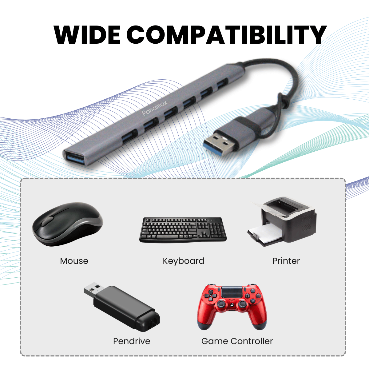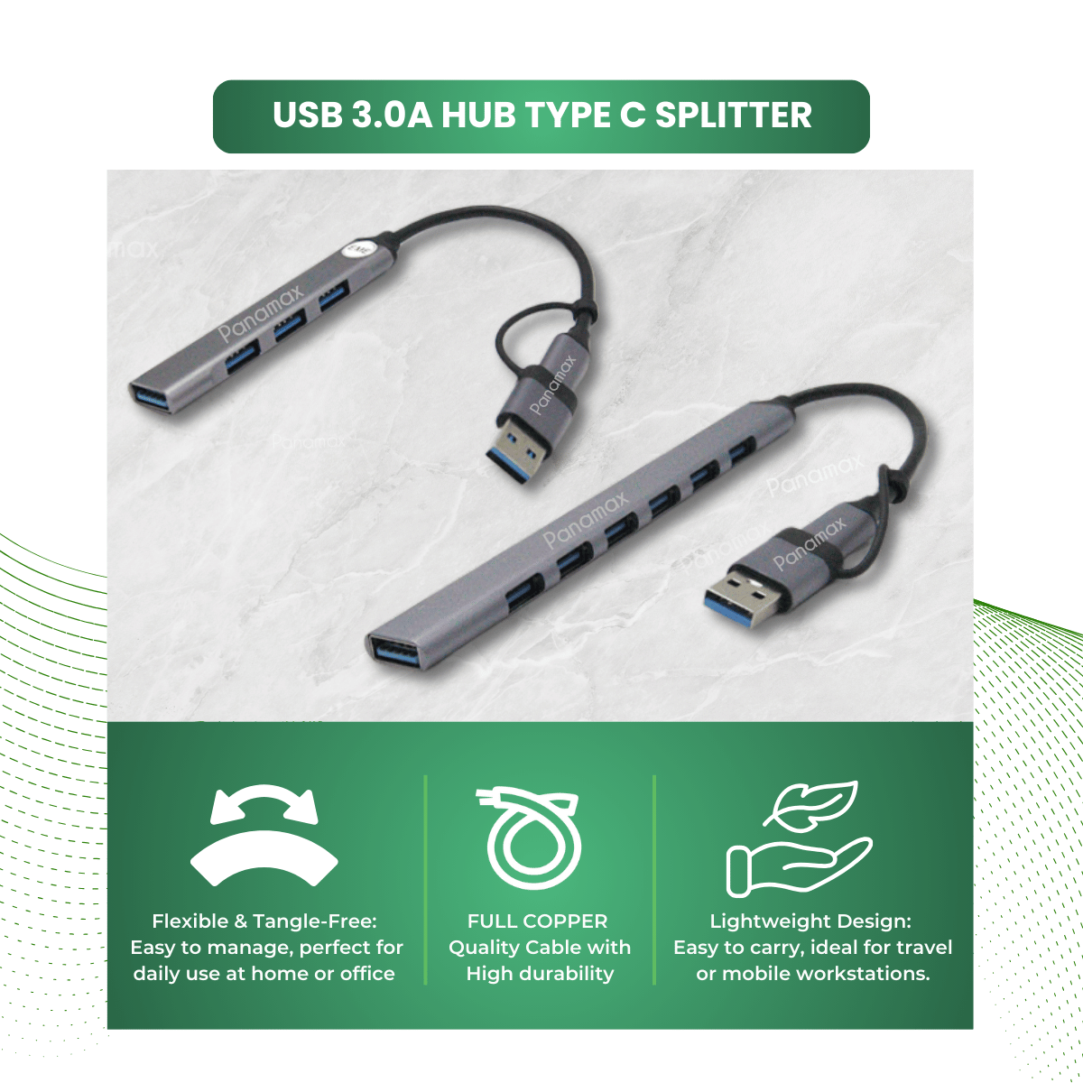 Maximize your device’s potential with our powerful USB 3.0 Ultra Speed 4/7 Port Type C Hub! This versatile hub transforms a single USB-C port into seven ultra-fast USB 3.0 connections, providing the expandability you need for all your peripherals while maintaining blazing-fast data transfer speeds.